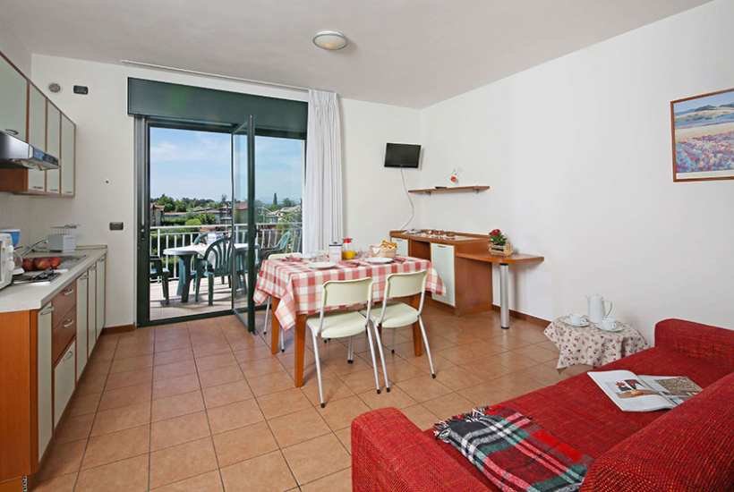 One-bedroom apartments, suitable to host from 2 to 4 people, equipped with 1 living room with 1 double sofa bed and 1 bedroom with two single beds. Some apartments A4 are located on the ground floor with a view over the pool and garden. Two of them are reserved for people with disabilities. Other apartments A4 are located on the first and second floor, with a view over the lake and pool or garden. The dining area has a kitchenette equipped with: